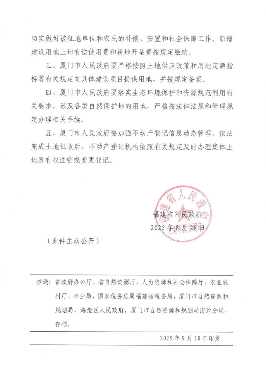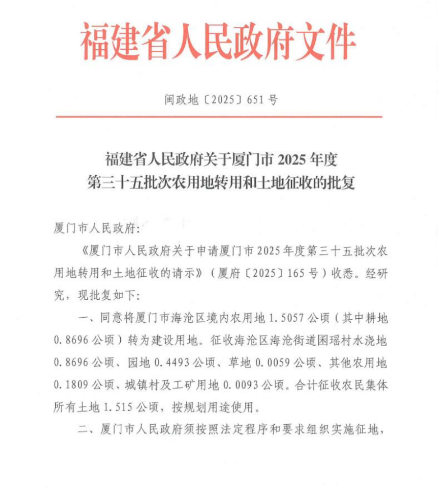 附件:福建省人民政府关于厦门市2025年度第三十五批次农用地转用和土地征收的批复(闽政地〔2025〕651号)