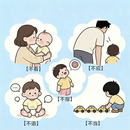 ✔ 不语/少语:1岁半还不会叫“妈妈”,2岁还说不出10个词。