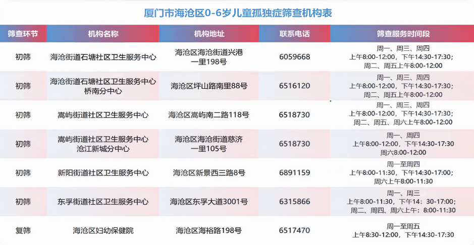 复筛:对0-6岁心理行为发育初筛异常(即初筛阳性)的儿童,海沧区妇幼保健院开展孤独症复筛,每个儿童每年可享受一次免费复筛。