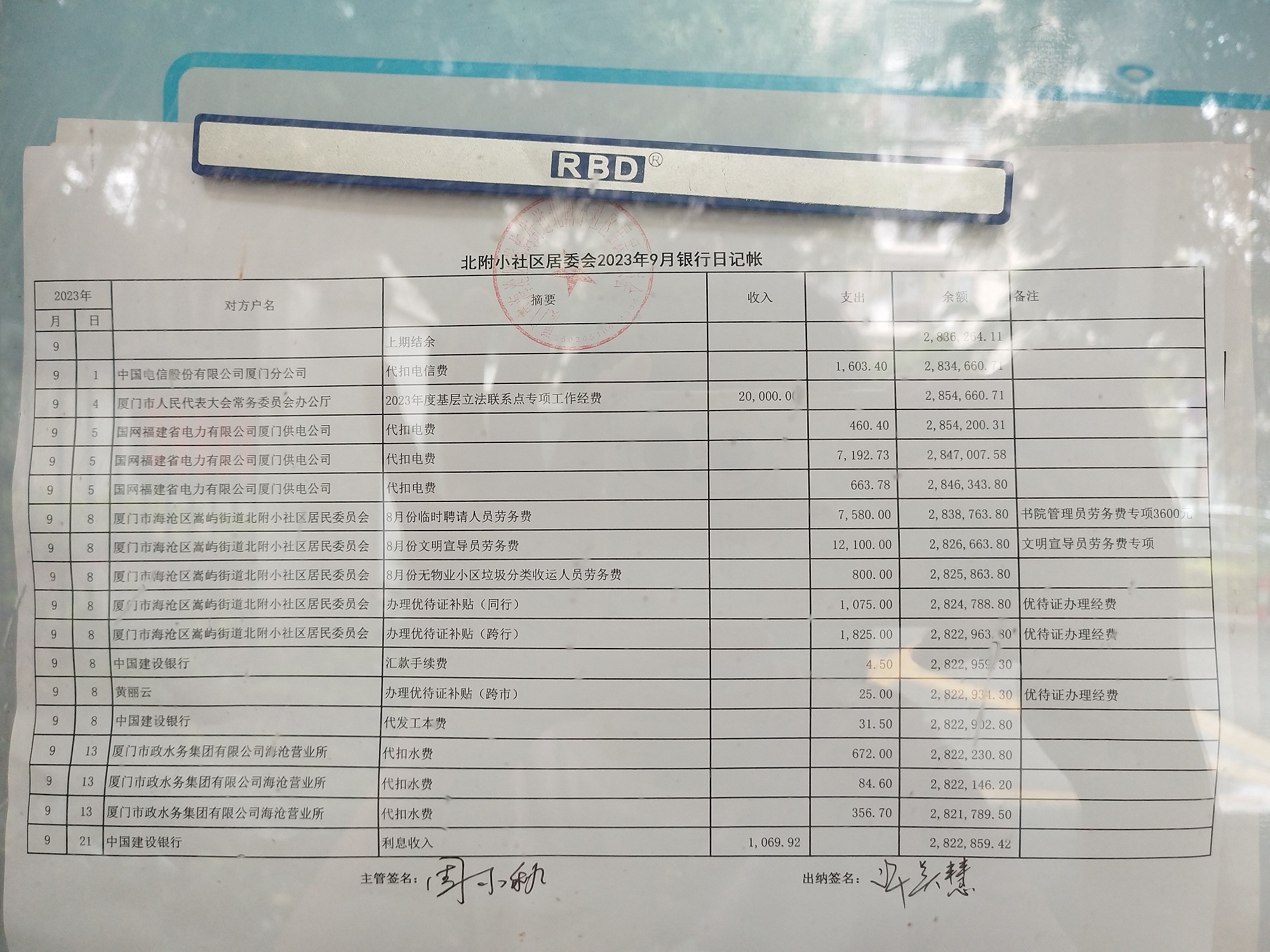 嵩屿街道北附小社区2023年第三季度居务公开,公示如下: