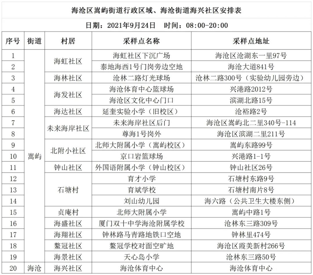 为及时有效发现和控制传染源,坚决阻断疫情扩散蔓延,决定于2021年9月24日08:00-20:00开展海沧区重点区域全员新冠病毒核酸检测。