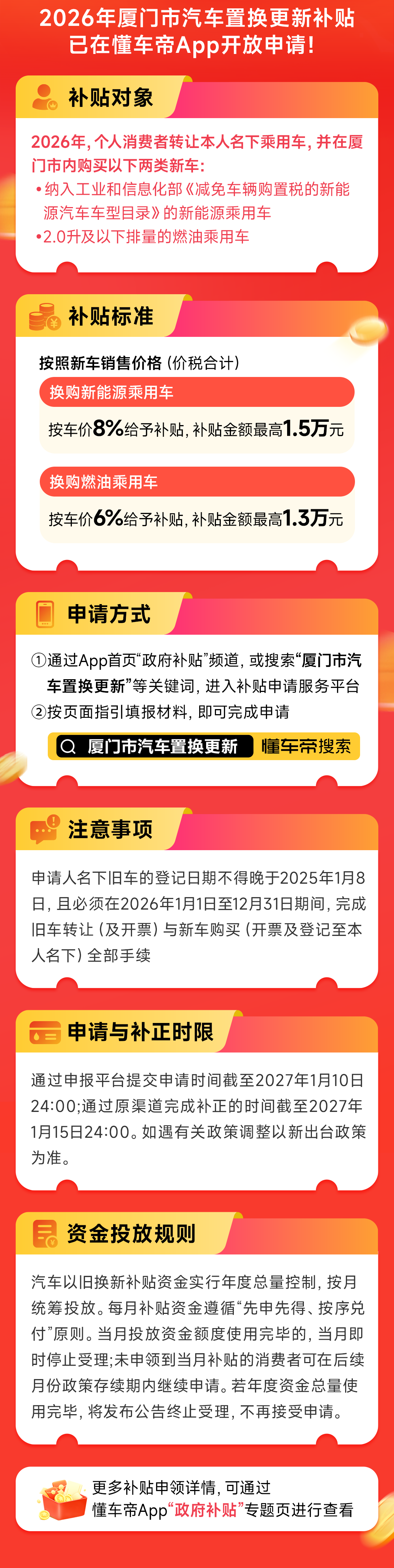 消费者可通过懂车帝App首页“政府补贴”频道,或搜索“厦门市汽车置换更新”等关键词,进入补贴申请服务平台,按页面指引填报材料即可完成申请。
