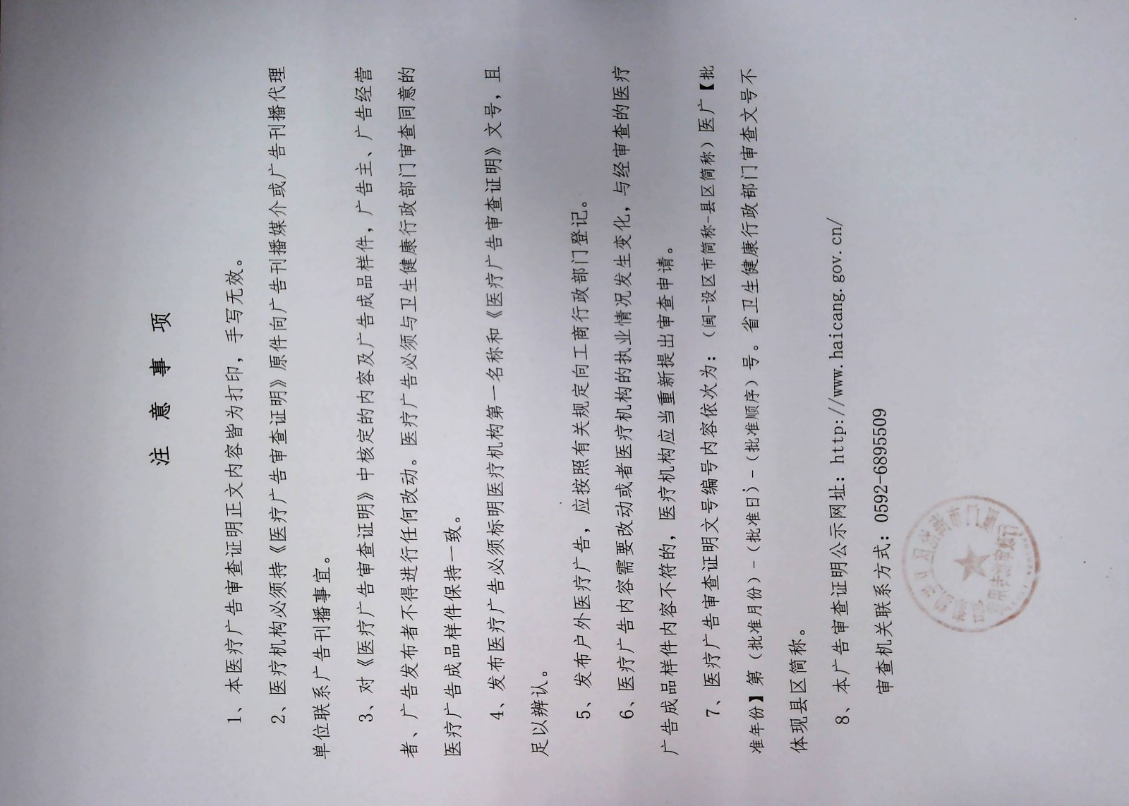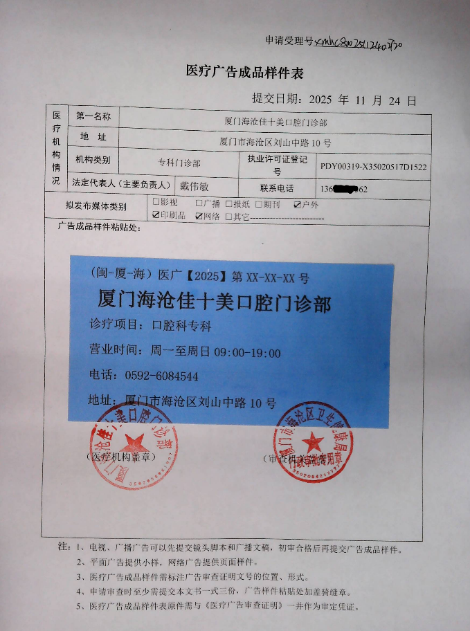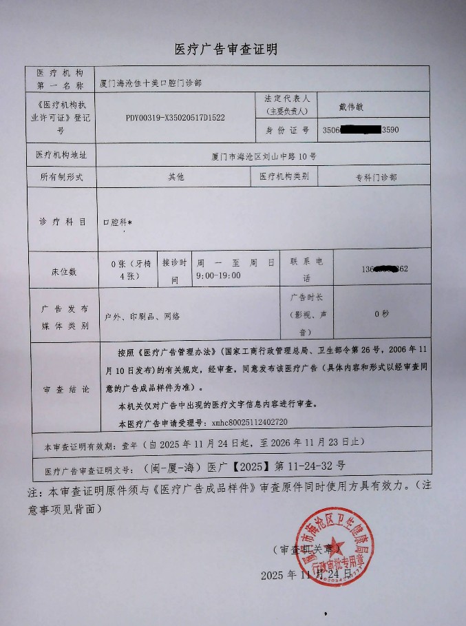 关于厦门海沧佳十美口腔门诊部“医疗广告审查证明”及“医疗广告成品样件表”公示