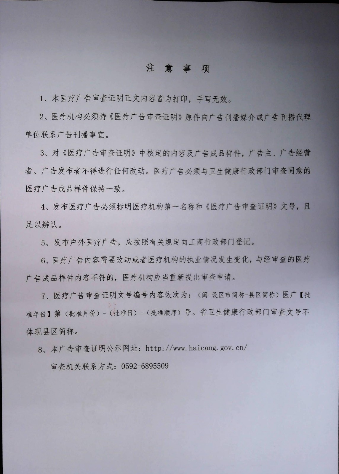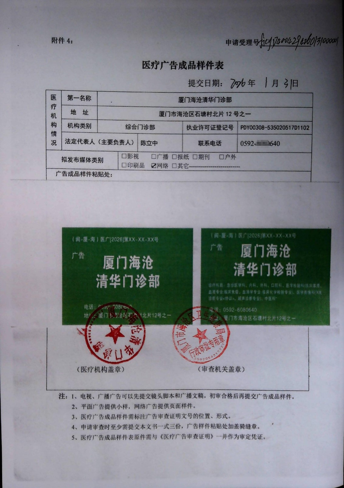 关于厦门海沧清华门诊部“医疗广告审查证明”及“医疗广告成品样件表”公示