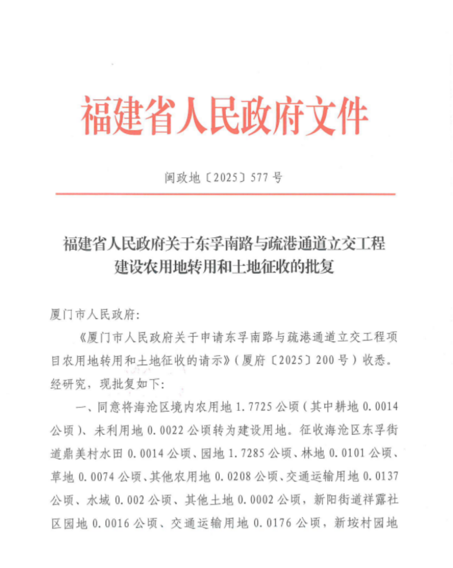 附件:福建省人民政府关于东孚南路与疏港通道立交工程建设农用地转用和土地征收的批复(闽政地〔2025〕577号)