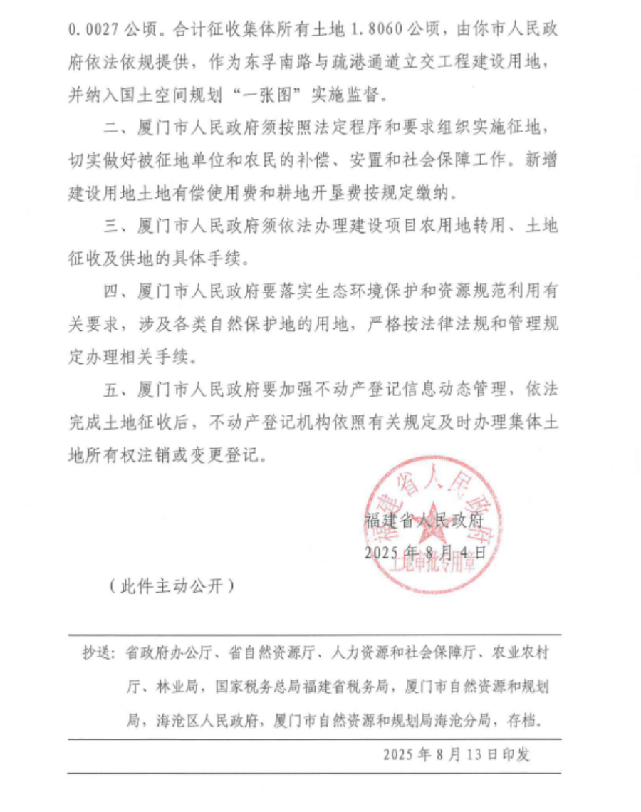 根据《中华人民共和国土地管理法》《中华人民共和国土地管理法实施条例》《厦门市集体土地征收与补偿若干规定》等有关规定,经《福建省人民政府关于东孚南路与疏港通道立交工程建设农用地转用和土地征收的批复》(闽政地〔2025〕577号)批准,现需征收海沧区东孚街道鼎美村集体土地17841平方米;新阳街道祥露社区集体土地192平方米;新垵村集体土地27平方米,合计征收集体土地18060平方米,作为东孚南路与疏港通道立交工程项目用地。现将有关事项公告如下: