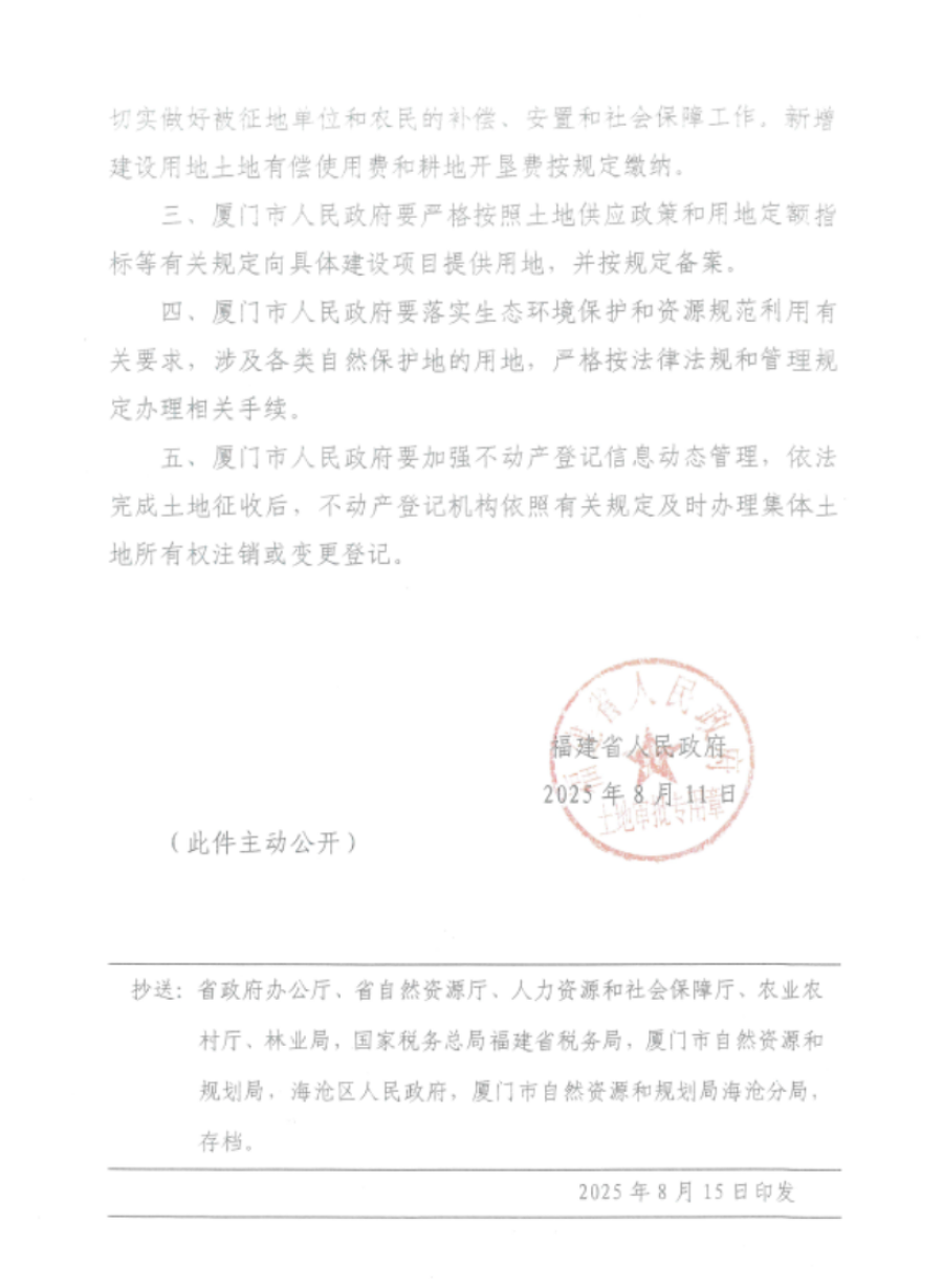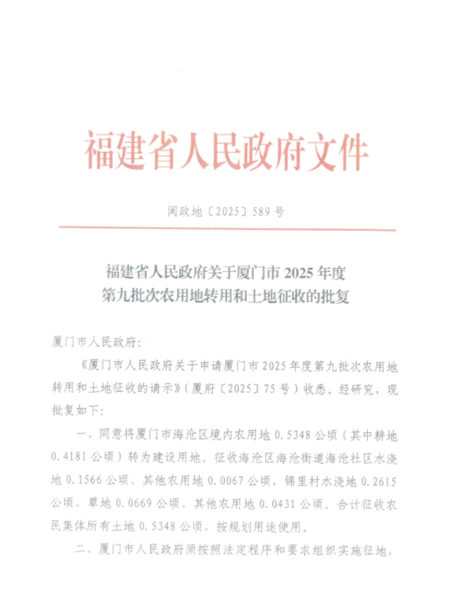 附件:福建省人民政府关于厦门市2025年度第九批次农用地转用和土地征收的批复(闽政地〔2025〕589号)