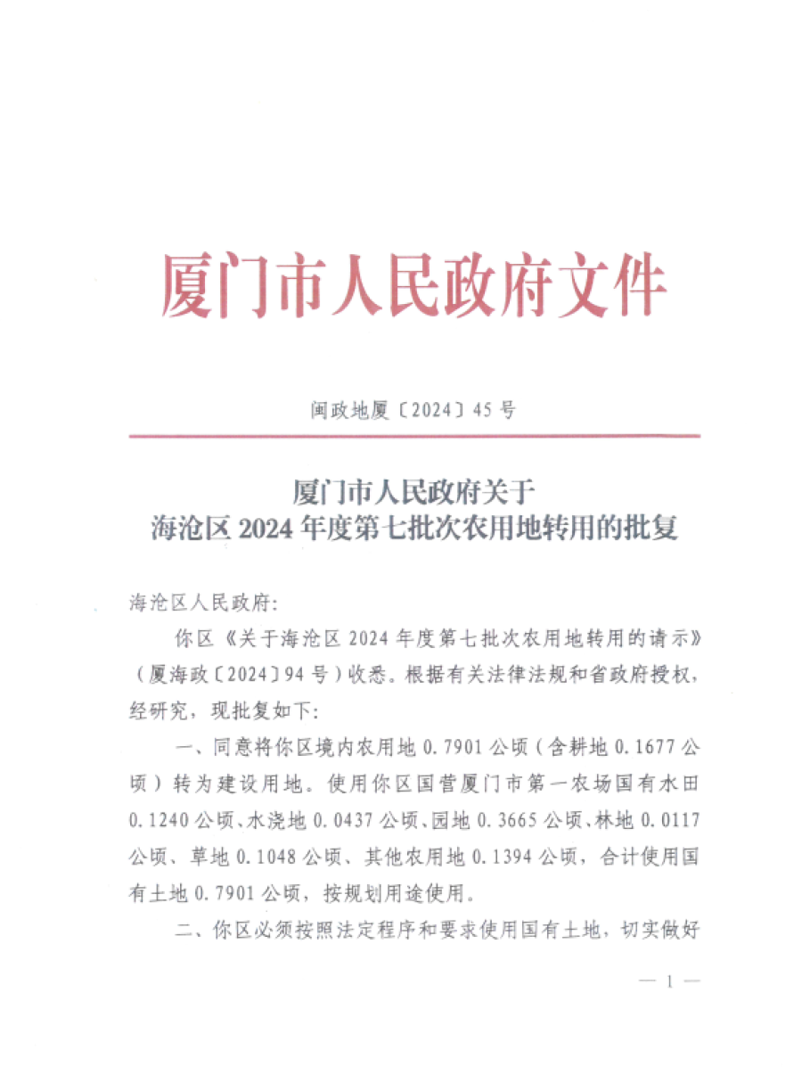附件:厦门市人民政府关于海沧区2024年度第七批次农用地转用的批复(闽政地厦〔2024〕45号)
