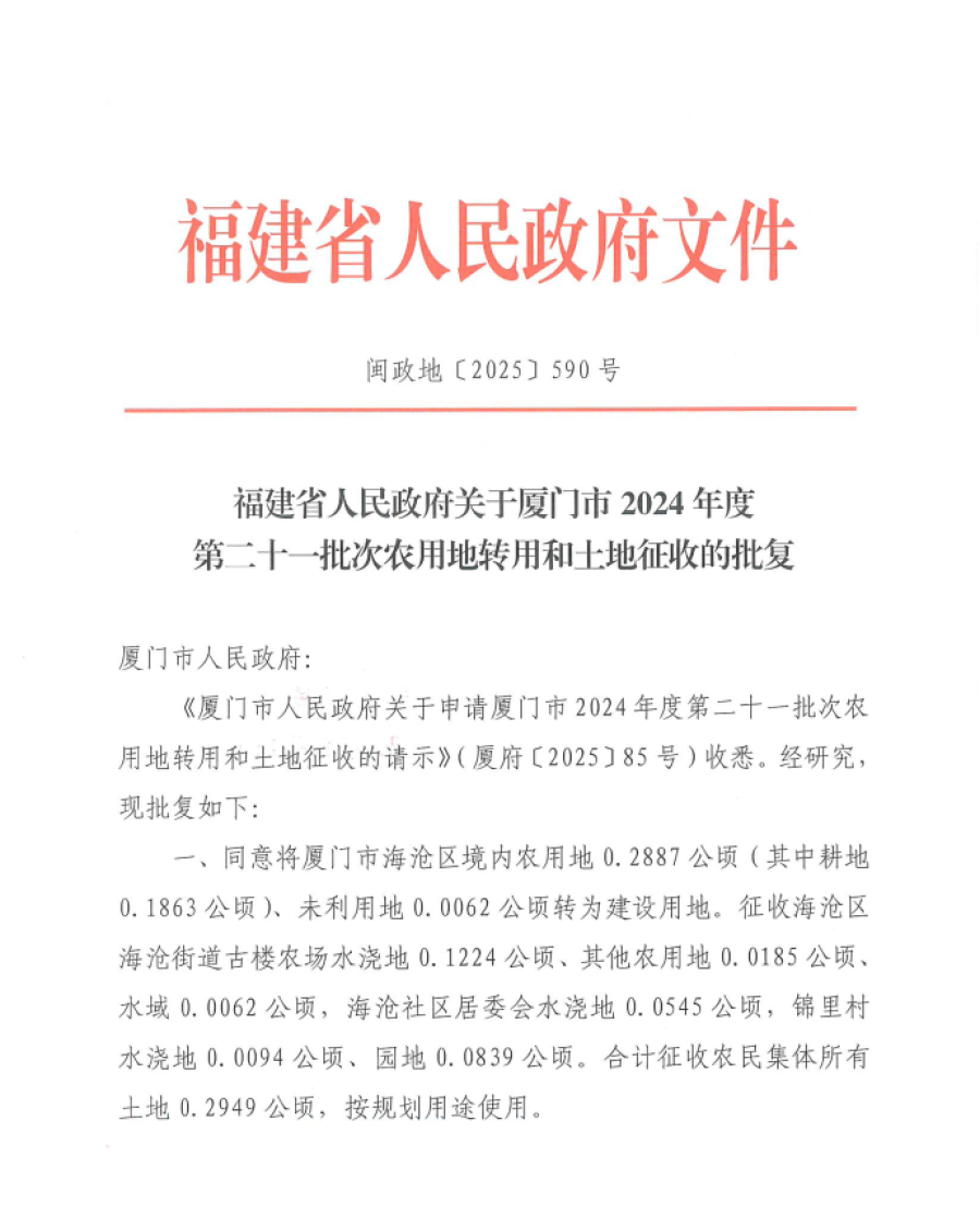 附件:福建省人民政府关于厦门市2024年度第二十一批次农用地转用和土地征收的批复(闽政地〔2025〕590号)