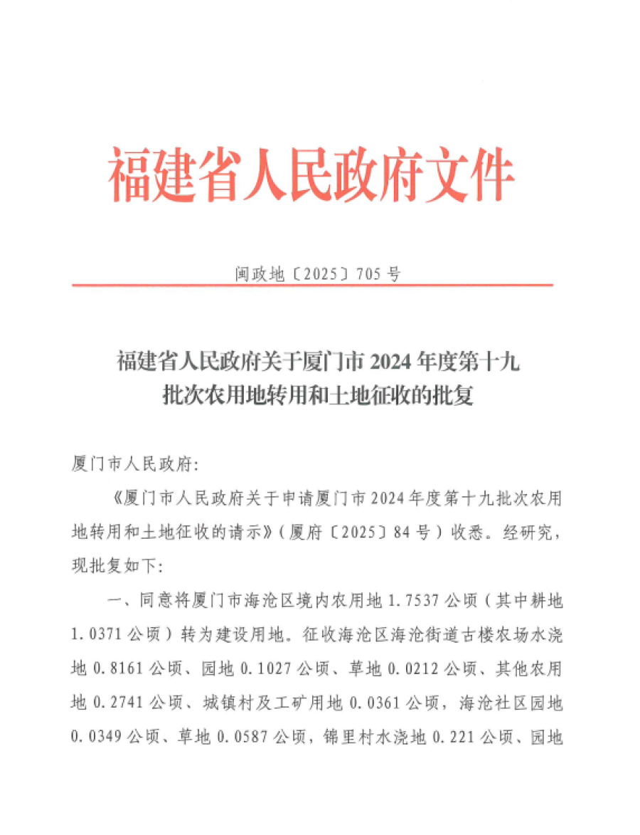 附件:福建省人民政府关于厦门市2024年度第十九批次农用地转用和土地征收的批复(闽政地〔2025〕705号)