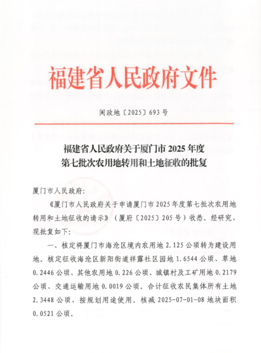 附件:福建省人民政府关于厦门市2025年度第七批次农用地转用和土地征收的批复(闽政地〔2025〕693号)