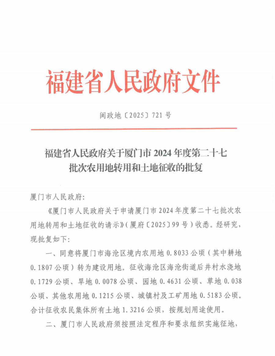 附件:福建省人民政府关于厦门市2024年度第二十七批次农用地转用和土地征收的批复(闽政地〔2025〕721号)
