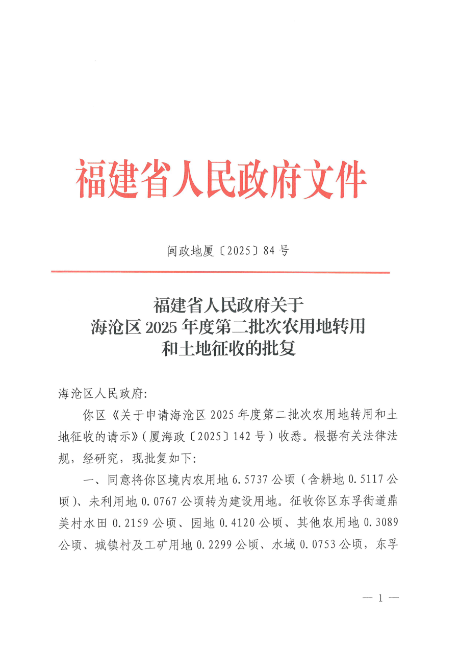 附件:福建省人民政府关于海沧区2025年度第二批次农用地转用和土地征收的批复(闽政地厦〔2025〕84号)