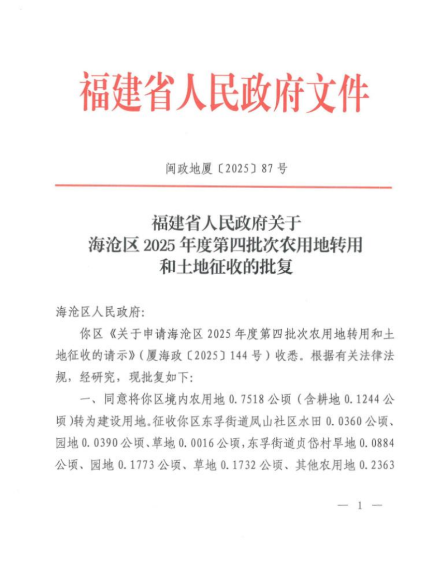 附件:福建省人民政府关于海沧区2025年度第四批次农用地转用和土地征收的批复(闽政地厦〔2025〕87号)
