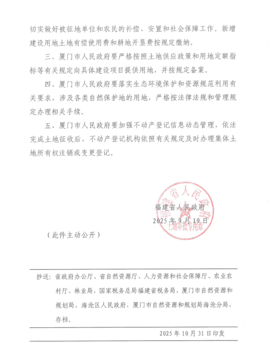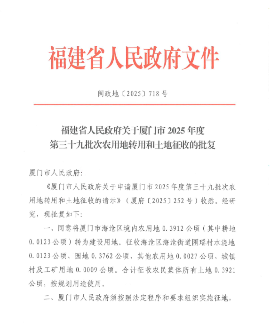附件:福建省人民政府关于厦门市2025年度第三十九批次农用地转用和土地征收的批复(闽政地〔2025〕718号)