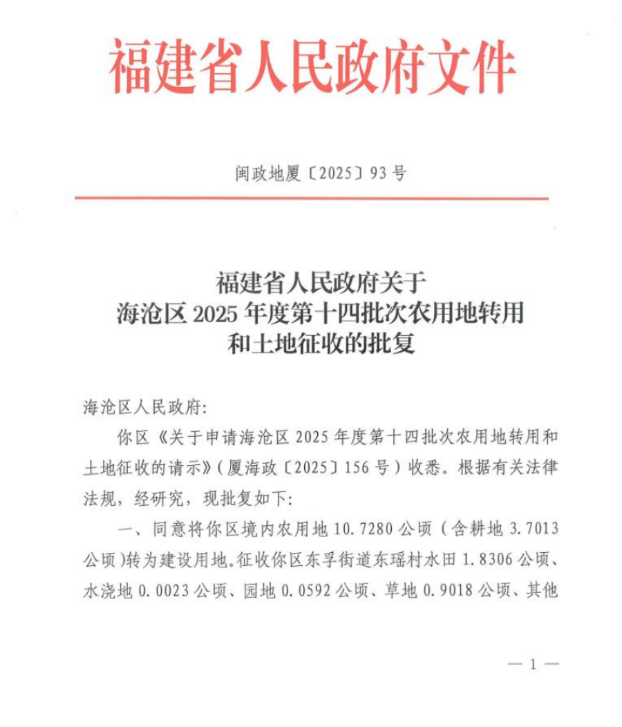 附件:福建省人民政府关于海沧区2025年度第十四批次农用地转用和土地征收的批复(闽政地厦〔2025〕93号)