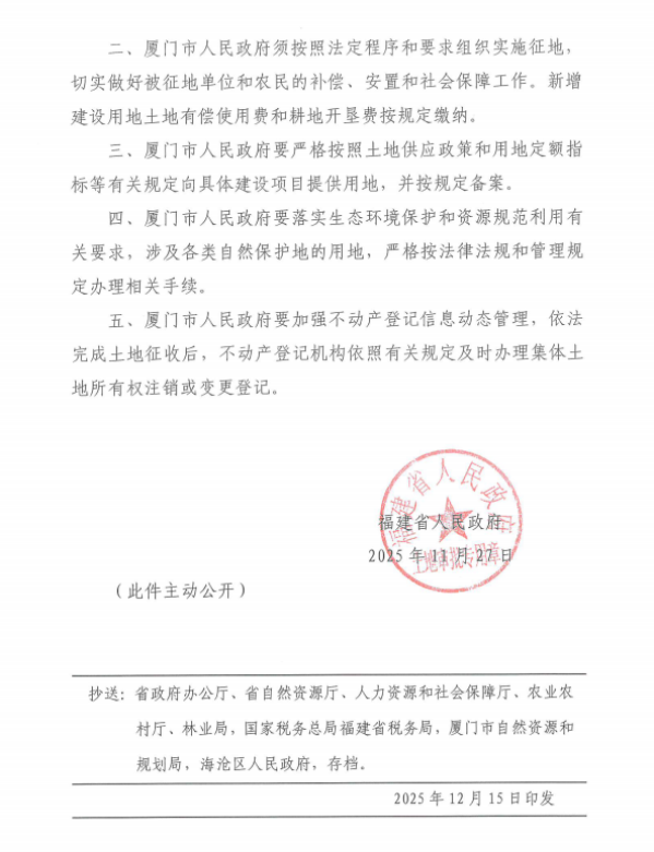 附件:福建省人民政府关于厦门市2025年度第六十七批次农用地转用和土地征收的批复(闽政地〔2025〕941号)