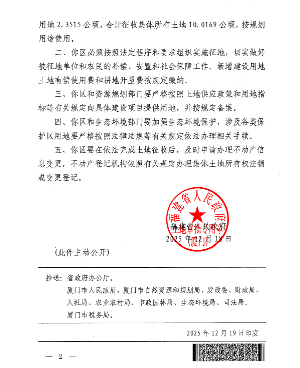 附件:福建省人民政府关于海沧区2025年度第十一批次农用地转用和土地征收的批复(闽政地厦〔2025〕125号)