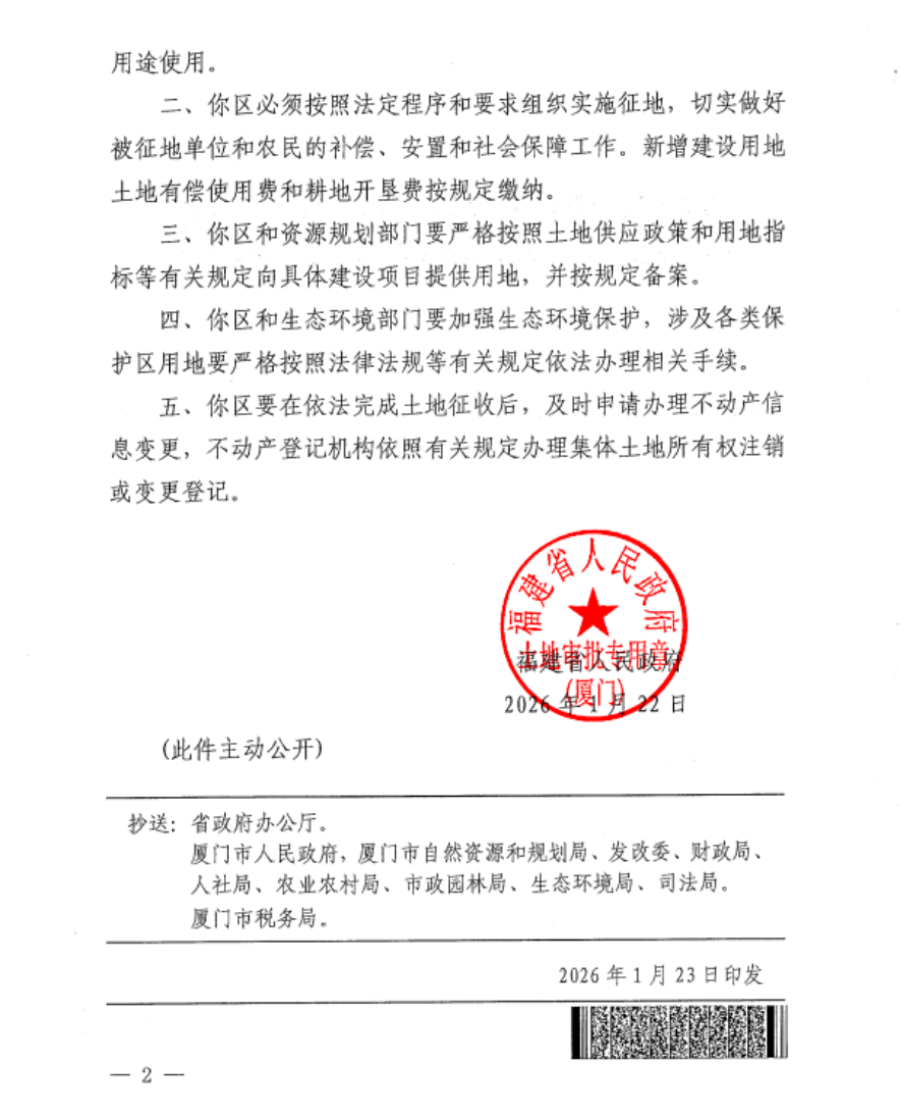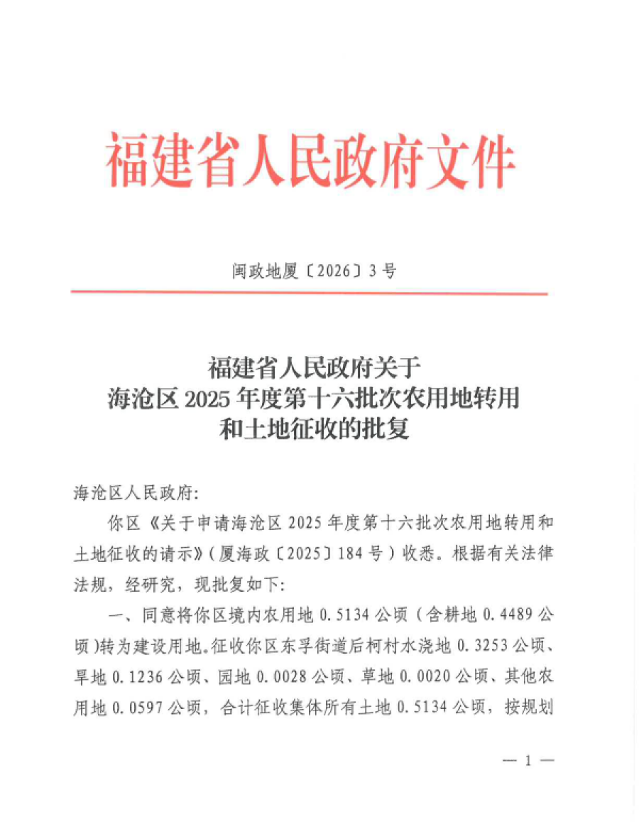 附件:福建省人民政府关于海沧区2025年度第十六批次农用地转用和土地征收的批复(闽政地厦〔2026〕3号)